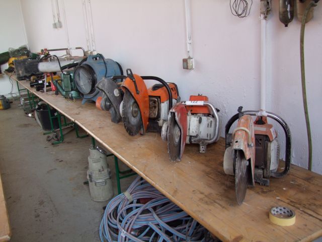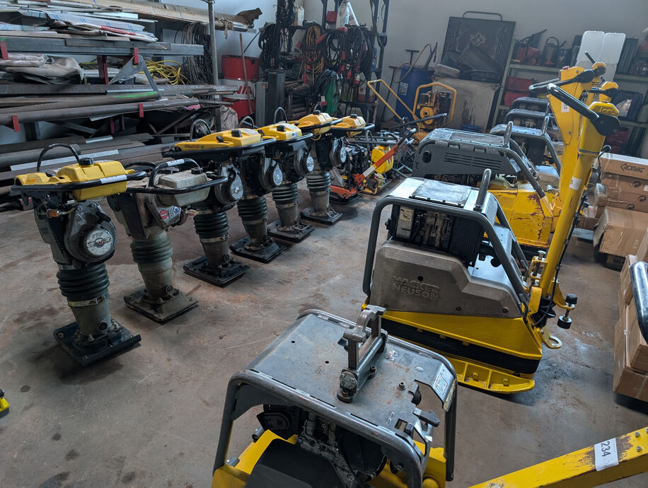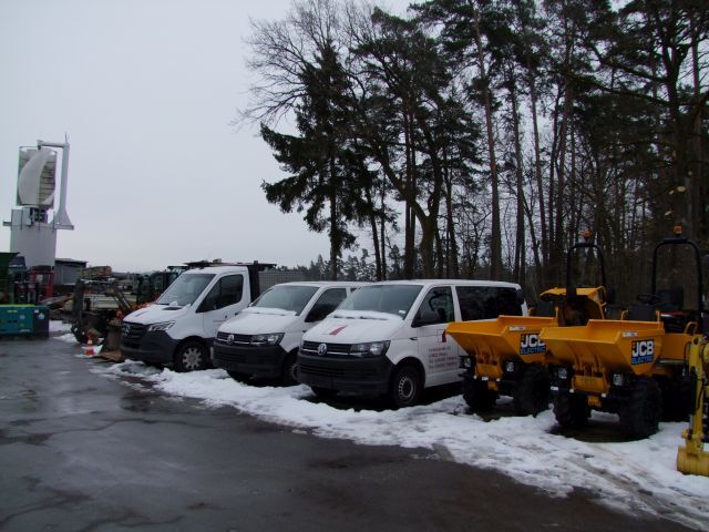 Ackerschlepper MB-Trac, PKW Audi, LKW Umsetzer MAN, Radlader (Kramer, Atlas-Weycor, Paus), Minibagger (Kubota, MachPro, H13), Mobilbagger Atlas, Baustellenkompressoren, 6-Meter-Abkantbank, Bandsäge, Tafelschere Schechtel, Kettendumper Kubota, Vakuumhebegerät, Container, Verdichtungsgeräte, Zäune, Weitspann- und Reifenregale, Diesel- und Benzingeneratoren, Dieseltankstellen, Stromaggregate, Gabelstapler (Still, Hangcha, Linde), Bauzäune, Gerüste, Kranbomben, Putzmaschinen, Trockenspritzgeräte, Bohranlage, Sandstrahlanlage Clemco, Baggeranbaugeräte, Fugenschneider, Werkzeugwagen, Kleingeräte, Handmaschinen u. v. m.