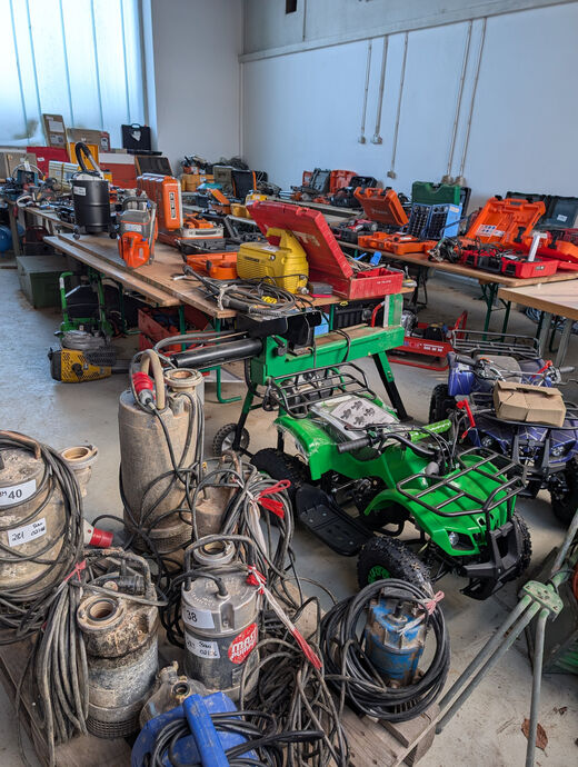 Kräne, Laderaupe, Radlader, Midi- und Minibagger, LKW-Kipper, Oldtimer Bulli T1, PKWs, Transporter, Motorräder, Beachbuggy, Golfcarts, Verdichtungsgeräte, Tankanlage, Asphaltfräse, Traktor, Kleinschlepper, Baggeranbaugeräte, Zäune, Kleingeräte, Handmaschinen,