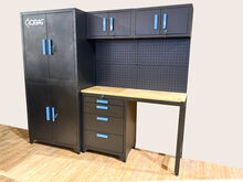 Werkstattschrankanlage Kromag KG-WW370, ca. 370/61/198 cm, 31-teilig, bestehend aus: 4 Metallschränken groß 1-türig (2x links öffnend, 2x rechts öffnend), Lochwand (8-teilig), 4 Oberschränke, Rubberwood Arbeitsplatte (zweiteilig), Ladenschrank 4-ladig, Ladenschrank 5-ladig, Ladenschrank 6-ladig, Unterschrank 2-türig, alle Schränke versperrbar, 12 Druckluftanschlüsse, 6-fach Steckdose, Diese Anlage ist freistehend und keine Komponente muss an einer Wand montiert werden (Rückwand und Oberschränke werden auf die mitgelieferten Träger montiert), originalverpackt in 11 Kartons