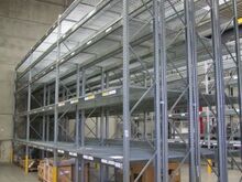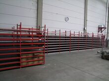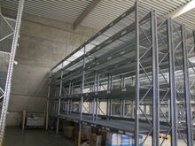 verzinktes Hochraumregallager mit 10 doppelten Stehern, Gittereinlegeböden, mit 5 Fächer, Länge ca. 3,60 m, Tiefe ca. 1,50 m, Höhe ca. 5 m, Fabr. Dexion, Typ P90M, Bj. 2012, Feldlast ca. 7.500 kg, Fachlast ca. 1.500 kg - bereits abgebaut und gestapelt