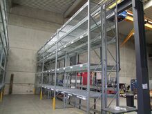 verzinktes Hochraumregallager mit 8 doppelten Stehern, Gittereinlegeböden, mit 5 Fächer, Länge ca. 3,60 m, Tiefe ca. 1,50 m, Höhe ca. 5 m, Fabr. Dexion, Typ P90M, Bj. 2012, Feldlast ca. 7.500 kg, Fachlast ca. 1.500 kg, mit Gitterzaun geschlossene Rückwand zur Absicherung von gelagerten Gütern