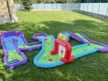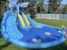 Happy Hop The Shark Pool 9421, Rutschen nass und trocken verwendbar, für max. 4 Kinder, l/b/h 460/460/240 cm, inklusive Gebläse, Schlauchsystem für 2 Wasserrutschen und 2 Wasserkanonen, Bodenanker, Reparaturset und Tragetasche, originalverpackt, 31 kg, für Kinder ab 3 Jahren
