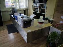 Schreibtischkombination mit zugehörigem Wandschrank, Mitteilteil Glas (farbig/dunkel), sowie Aktenboard 3 teilig, mit Schubläden und Glastüren, Maße Schreibtisch ca. 270 x 160 cm, Wandschrank ca. 240 (breit) x 220 (hoch) x 40 (tief), Sideboard ca. 180 (breit) x 105 (hoch), 43 (tief) cm - nur Möbel ohne darauf befindliche EDV oder sonstige Büroeinrichtung