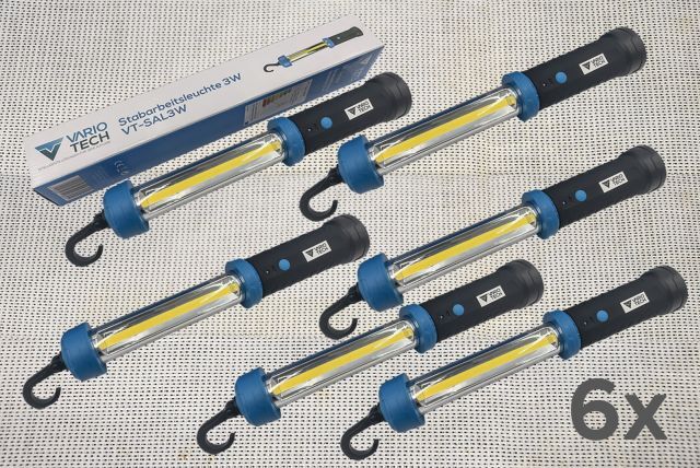6 Stück Akku LED Stabarbeitsleuchte Vario Tech VT-SAL3W, 6 Stück, 3W, 600 Lumen, mit Bodenmagnet und Haken, wiederaufladbarer Akku, 1200 mAh, ca. 3 Stunden Ladezeit, Arbeitszeit ca. 2,5 Stunden, aufladbar mit Micro USB Kabel (im Lieferumfang enthalten), originalverpackt (je 40/5,5/5,5 cm)