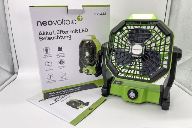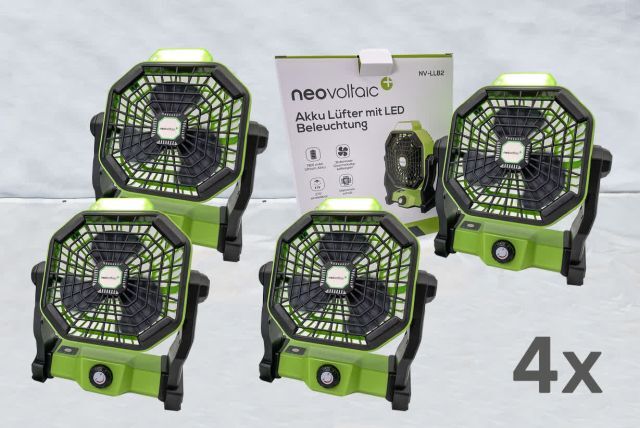 4 Stück Akku Lüfter mit LED Beleuchtung neovoltaic NV-LLB2, 4 Stück, schwenkbarer Ventilator mit Akku (3,7V, 7800 mAh), Geschwindigkeit stufenlos regelbar, 6W, LED Licht 2W 4stufig einschaltbar (25%, 50%, 75%, 100%), Haken auf Unterseite, bis zu 15 Stunden Einsatzzeit pro Ladung, Mini USB Ladebuchse