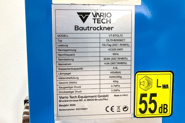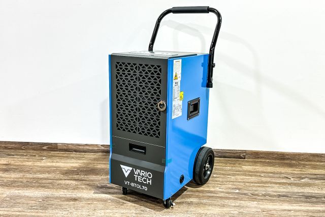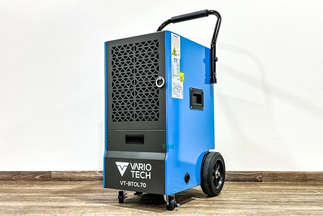 Bautrockner Vario Tech VT-BTOL70, Bautrockner mit Kompressor, max. 70 Liter /24 h, Automatikfunktion (eingestellter Feuchtigkeitswert wird geregelt), Defrostfunktion, Stundenzähler, 230 V, 923 W, 50 Hz, Fronttüre, leicht zu reinigender Filter, entnehmbarer Wassertank 5,5 Liter, Kühlmittel R290, 44 kg