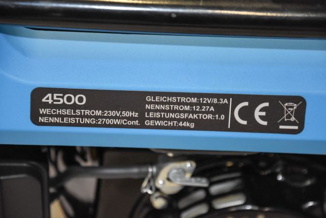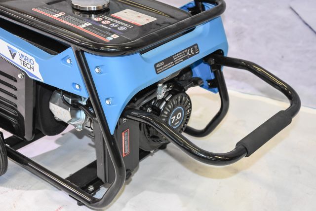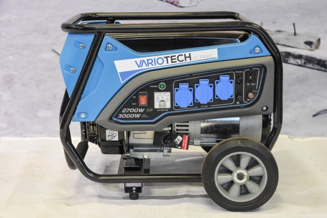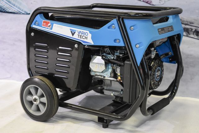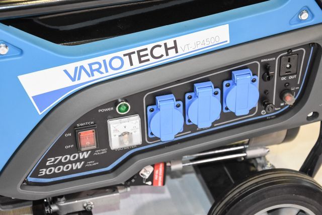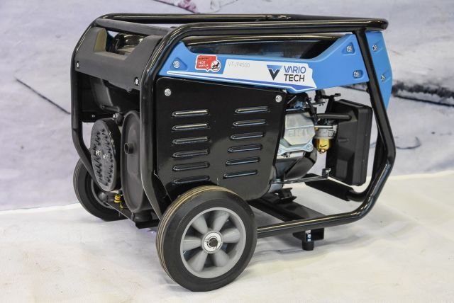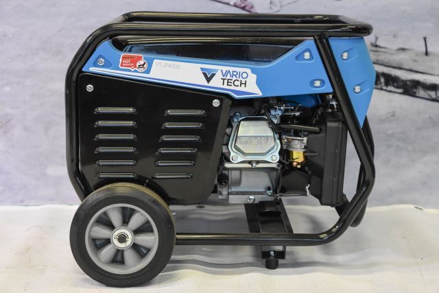Benzingenerator Vario Tech VT-JP4500, max. Leistung 3 kW, Nennleistung 2,7 kW, Ausgang 230 V und 12 V/ 8,3 A, Kupferwicklung, Tankkapazität 15 Liter, Motorleistung 5 kW, 44 kg, mit Räder und klappbaren Transportgriff, Handstart, Listenpreis 629,-
