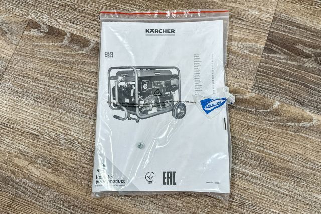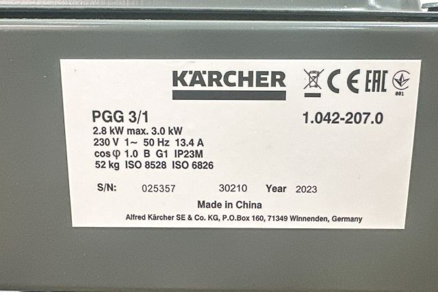 Benzingenerator Kärcher Professional PGG 3/1, max. Leistung 3,0 kW, Nennleistung 2,8 kW, 208 cm3, ca. 65/62/55 cm, Tankkapazität: 15 l, Eigengewicht: 51,7 kg, Gleichstromausgang (12V), Schutzklasse IP23, Ölmangel- und Überlastschutz, Kraftstoffanzeige, Steckdose 1-Phasig Typ F (Schuko), automatischer Spannungsregler AVR, mit pannensicheren Rädern und klappbarem Schubbügel, Elektrostart, UVP: 750,00