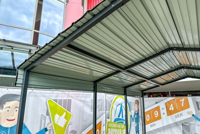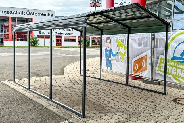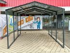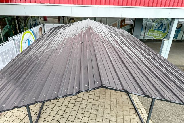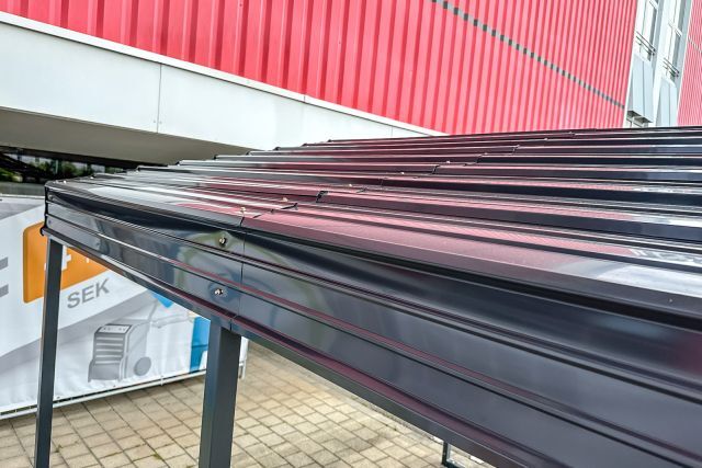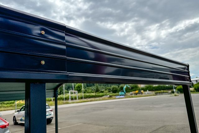 Carport Kromag KG-CP135, ca. 13,5 m2, Abmessungen l/b/h 465/295/250 cm, maximale Einfahrtshöhe in der Mitte: ca. 242 cm, geringste Einfahrtshöhe am seitlichen Steher: ca. 204 cm, Material: 0,3 mm verzinktes Stahlblech Dach - pulverbeschichtet, 5/5 cm verzinkter Stahlrohrrahmen, Farbe: Anthrazit RAL7016, originalverpackt in 3 Kartons - gesamt ca. 180 kg (171/50/10 cm, 210/40/12,5 cm, 184/39/12 cm