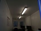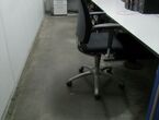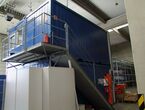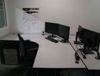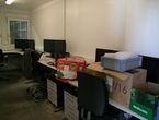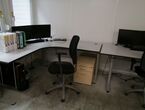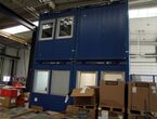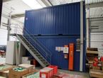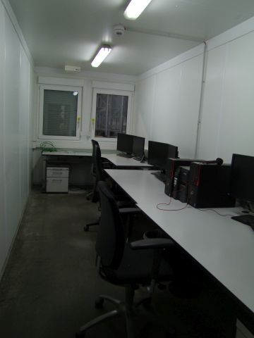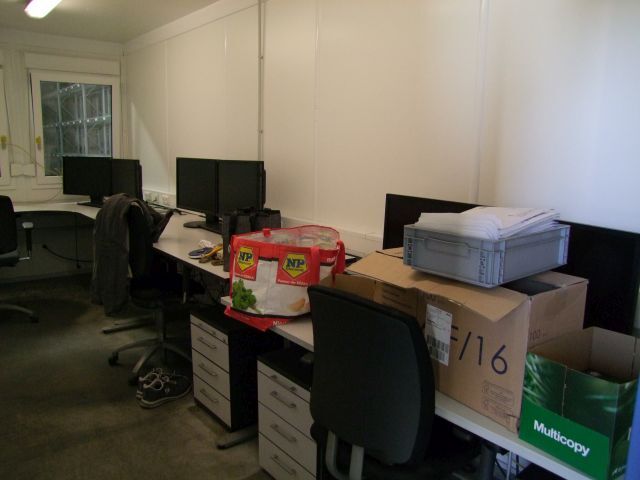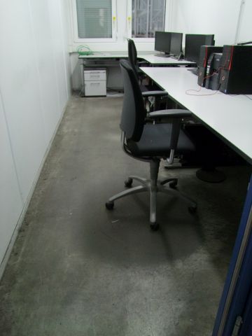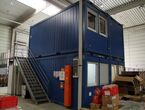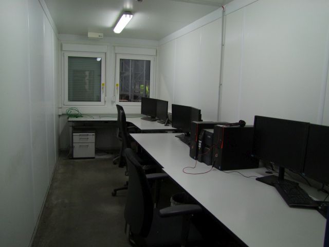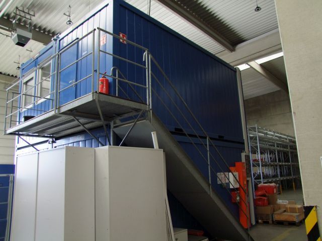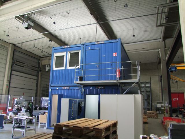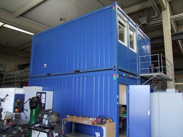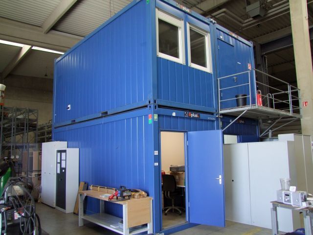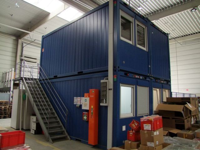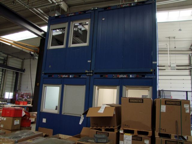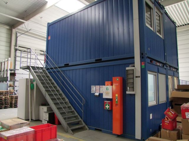 Containerkombination aus 4 Containern BL-Gruppe, 20 Fuß Container, im unteren Bereich Einzelncontainer geschlossen, mit Türen und stirnseitig 2 Fenstern, die beidne oberen Container als Großraumzelle verbaut mit offener Mittelwand, Aufgangstreppe und Geländer, installiert als Büros mit Büroausstattung, Schreibtische, Bürostühle, Monitore Fabr. Samsung - ohne Rechner