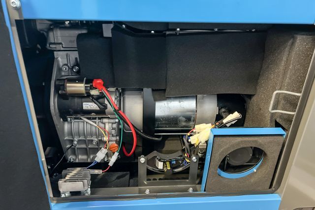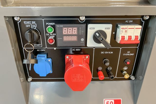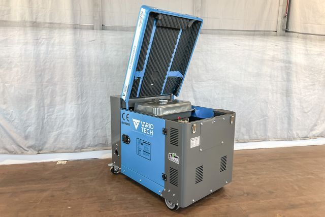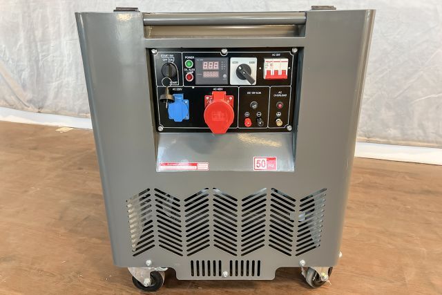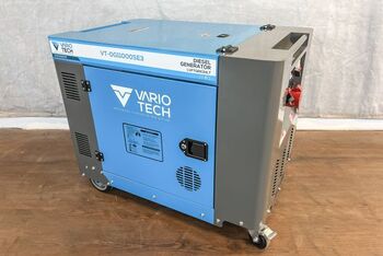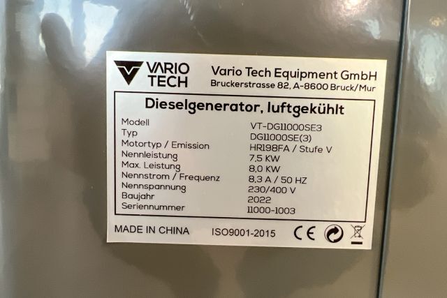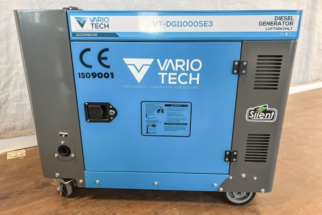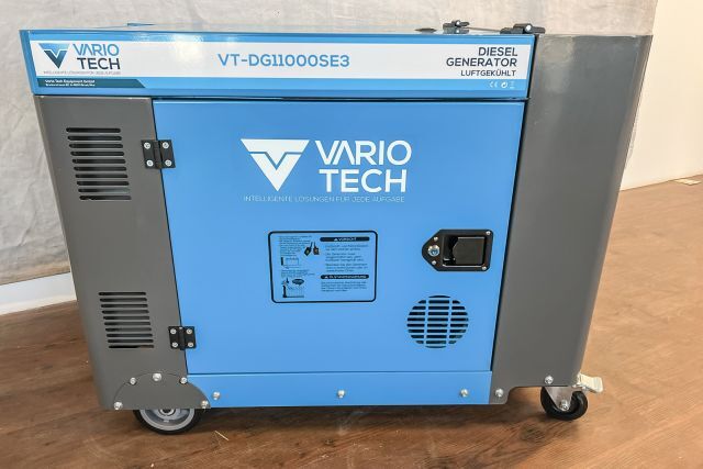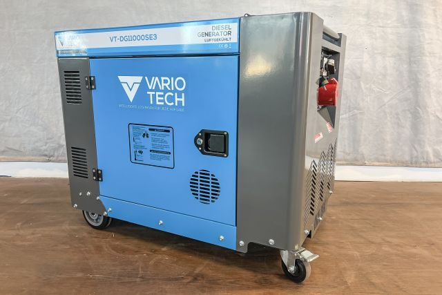 Dieselgenerator Vario Tech VT-DG11000SE3 Dieselgenerator, schallgedämmt, Motorleistung 11 kW, max. Leistung 10 kVA (8 kW), Nennleistung 9,37 KVA (7,5 kW); 12 V, 230 V und 400 V Ausgang; 8,3 A, 50 Hz, Elektrostart, großes Digitalpanel, 2 lenkbare und 2 fixe Räder, Serviceklappe, 210 kg, originalverpackt (107/67/81 cm, 220 kg), Listenpreis 3.990,-