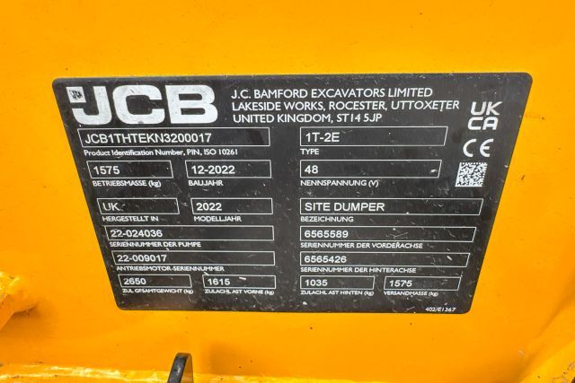 Elektro Dumper JCB 1T-2E, 10 kWh Batterie, 20 kW Spitzenleistung, 13,8 Betriebsstunden, 48 V Systemspannung, Baujahr: 12/2022, FIN: JCB1THTEKN3200017, Gewicht und Abmessungen: Nutzlast: 1.000 kg,