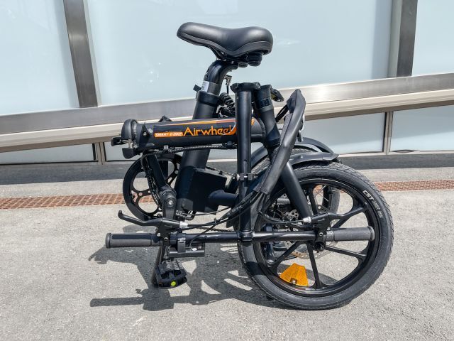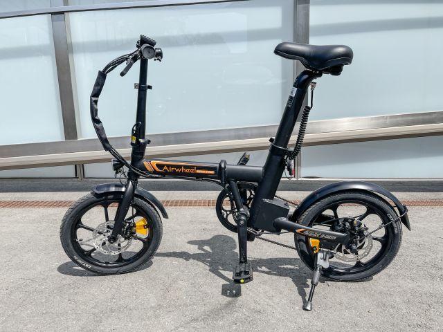 Elektro Faltrad Airwheel R5+, schwarz, Leistung 250 W, 288,6 Wh; 36 V; 7,8 Ah, max. 25 km/h, Ladezeit 180 min, Reichweite max. 40 km, Tragkraft 120 kg, Größe und Gewicht 135/61/107 cm 18,5 kg, Größe gefaltet 72/50/76 cm, Größe und Gewicht verpackt 133/27/70 cm 24,5 kg, mit bürstenlosem Motor, 16 Zoll Reifen, Beleuchtung, Kotflügel, Batterieanzeige sowie Scheibenbremse vorne und hinten, Akku integriert im Sattelrohr (Sattelrohr könnte zum Laden z.B. in die Wohnung mitgenommen werden)