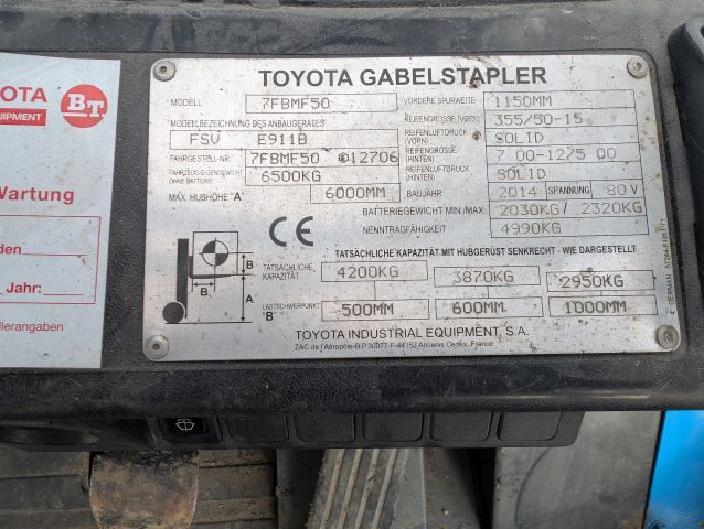Gabelstapler Fabr. Toyota, Typ 7FBMF50, Bj. 2014, ca. 2.800 B.Std., Hubkraft ca. 5.000 kg Hubhöhe ca. 6.000 mm, Seitenschieber