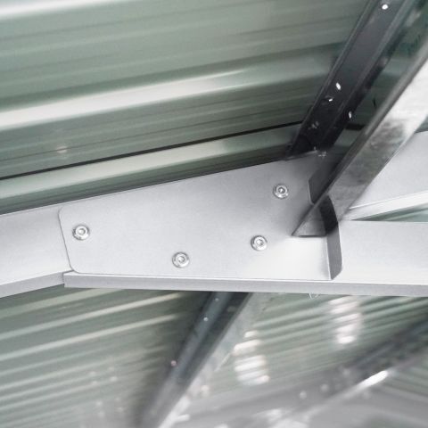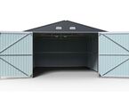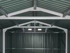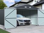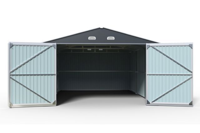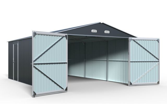 Garage Kromag KG-G23, Stellfläche: ca. 23 m2, Abmessungen l/b/h 602/386/237 cm, Material Rahmen: Verzinkter Stahl, 0,6 1,0 mm stark, Stahlrohre: 0,8 mm stark, pulverbeschichtet, Wände & Dach: Verzinkte Stahlbleche, 0,25 mm stark, lackiert, Satteldach mit 4 Lüftungsöffnungen für optimale Belüftung und Kondensationsschutz, Große Doppelflügeltür vorne: ca. 288/197 cm, Seitentür mit Einzelflügel: ca. 78/186 cm, Türen verschließbar, Inklusive verstärktem Dachrahmen und Wandverstrebungen, ideal für Fahrzeuge, Werkzeuge oder als zusätzlicher Stauraum, originalverpackt in 1 Holzkiste ca. 290 kg (212/74/42 cm)