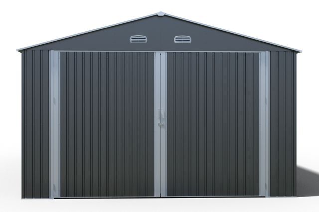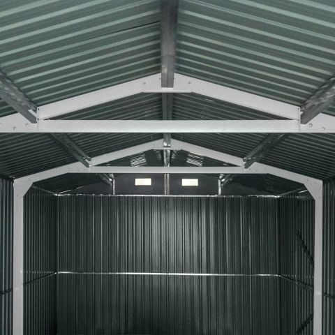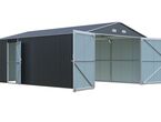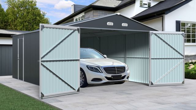 Garage Kromag KG-G23, Stellfläche: ca. 23 m2, Abmessungen l/b/h 602/386/237 cm, Material Rahmen: Verzinkter Stahl, 0,6 1,0 mm stark, Stahlrohre: 0,8 mm stark, pulverbeschichtet, Wände & Dach: Verzinkte Stahlbleche, 0,25 mm stark, lackiert, Satteldach mit 4 Lüftungsöffnungen für optimale Belüftung und Kondensationsschutz, Große Doppelflügeltür vorne: ca. 288/197 cm, Seitentür mit Einzelflügel: ca. 78/186 cm, Türen verschließbar, Inklusive verstärktem Dachrahmen und Wandverstrebungen, ideal für Fahrzeuge, Werkzeuge oder als zusätzlicher Stauraum, originalverpackt in 1 Holzkiste ca. 290 kg (212/74/42 cm)