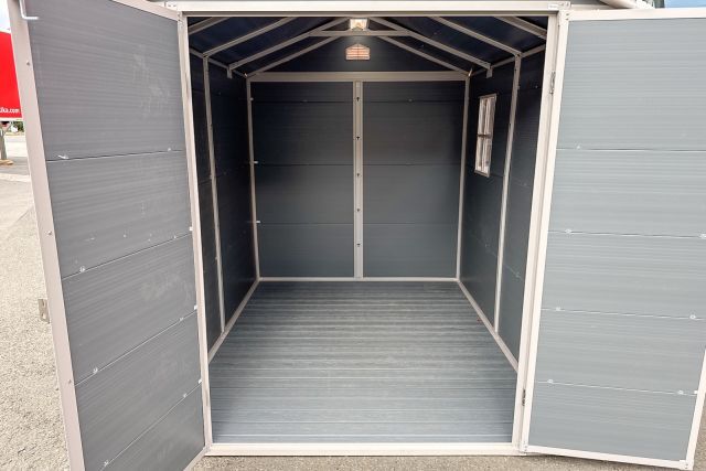 Garten Gerätehaus Kromag KG-GH48, ca. 4,8 m2, Abmessungen l/b/h 243/196/213 cm, Wandhöhe 171 cm, Basis 233/185 cm, 14 mm Polypropylen Doppelwandplatten, verzinkter Rahmen, 2 Türen (gesamt 117/165 cm) 1 Fenster (40/55 cm), 2 Lüftungsöffnungen, Farbe: Grau und Weiß, originalverpackt in 4 Kartons - gesamt ca. 109 kg (2x 184/55/10, 126/54/35 cm und 184/40/21 cm)