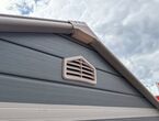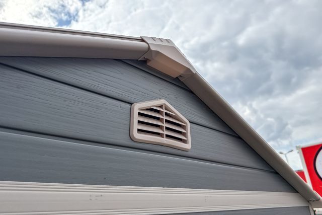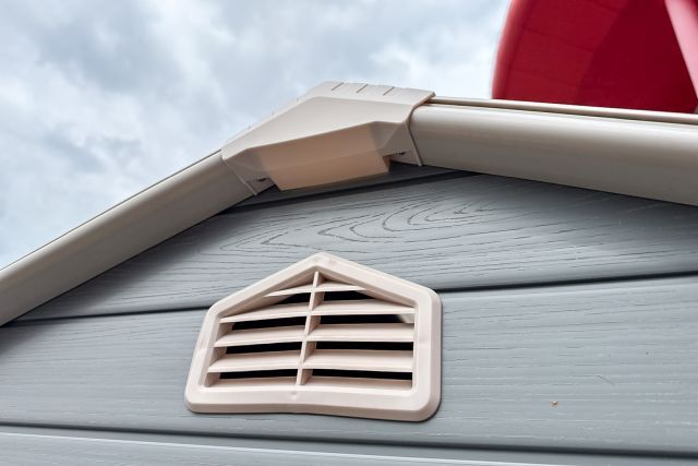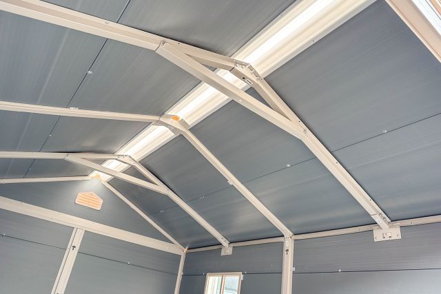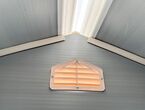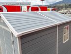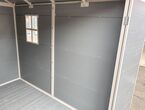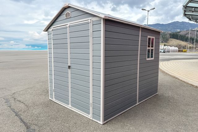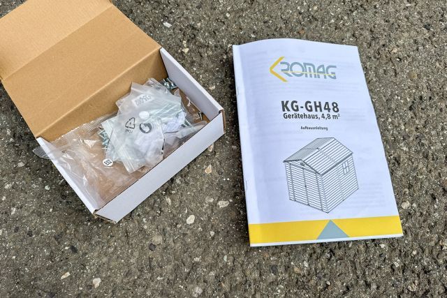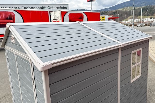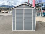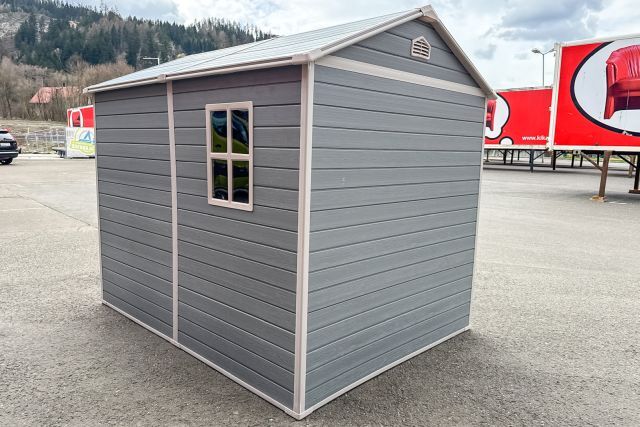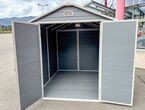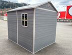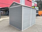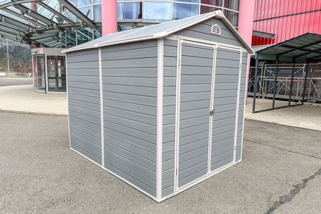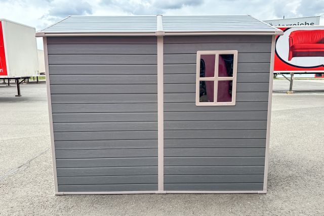 Garten Gerätehaus Kromag KG-GH48, ca. 4,8 m2, Abmessungen l/b/h 243/196/213 cm, Wandhöhe 171 cm, Basis 233/185 cm, 14 mm Polypropylen Doppelwandplatten, verzinkter Rahmen, 2 Türen (gesamt 117/165 cm) 1 Fenster (40/55 cm), 2 Lüftungsöffnungen, Farbe: Grau und Weiß, originalverpackt in 4 Kartons - gesamt ca. 109 kg (2x 184/55/10, 126/54/35 cm und 184/40/21 cm),