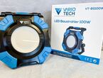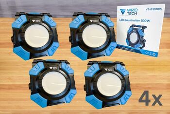Posten mit 4 Stück LED Baustrahler Vario Tech VT-BS100W, 4 Stück, 100W, Aluminiumgehäuse (Scheinwerfer), IP54, 10.000 Lumen, Lichtfarbenwechselschalter, wahlweise Lichtfarbe 2700K/4500K/6500K, 2 Steckdosen 230V, 2 USB Ausgänge je 5,0V 2,1A, Kabel 3m, 2 stufig verstellbare Leuchtkraft (50% und 100%)