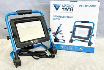 LED Baustrahler Vario Tech VT-LBS100W, 100W, 9000 Lumen, Lichtfarbe 5000K, IP65, Strahlwinkel 120°, Gummischutzhülle am Scheinwerfer, integrierte Kabelhalterung, Kabel 3m