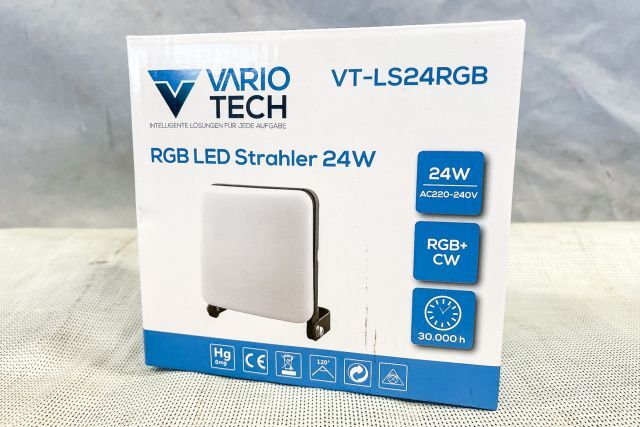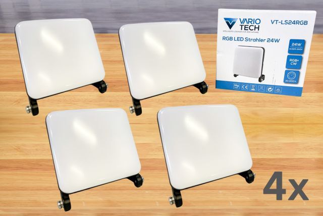 4 Stück RGB-CW LED Flutlicht Vario Tech VT-LS24RGB tuya, 4 Stück, 24W, RGB+CW, Aluminiumgehäuse, Abstrahlwinkel 90 Grad, wasserdicht IP65, APP gesteuert (tuya), dimmbar, weisse Lichtfarbe verstellbar (CW: kaltes Licht/warmes Licht), stufenlose Farbumstellung (RGB), vorprogrammierte Licht-Szenen, Musikeffekte (Lichtfarbe und Intensität passt sich dem Rhythmus der Musik an), originalverpackt.