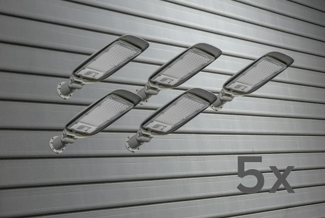 5 Stück LED Straßenleuchten Vario Tech VT-OL100W, 5 Stück Aluminiumgehäuse, auch für den Außenbereich, IP65, 100W, 10.000 Lumen, Lichtfarbe 5000K, Strahlwinkel 90°, für Wandmontage und Montage auf Rohr (88 mm), Neigung einstellbar, einzeln originalverpackt, im Überkarton zu 5 Stück, gesamt ca. 10 kg