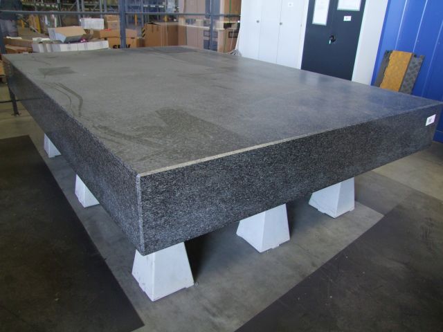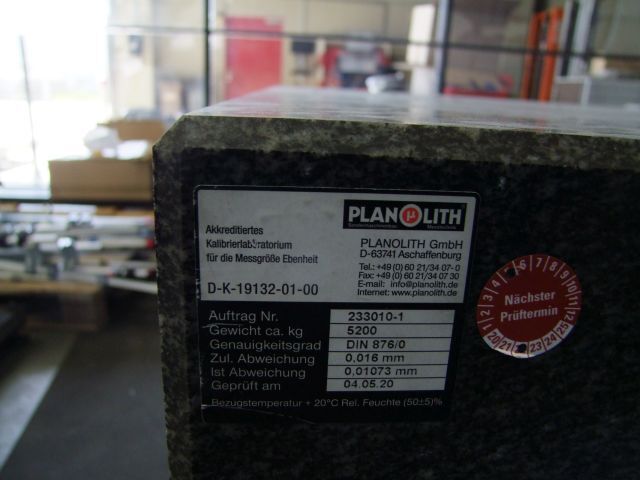 Messplatte Breite ca. 2 m, Länge ca. 3 m akkreditiertes Kalibrierlaboratorium für die Messgröße Ebenheit, Fabr. Planolith, Kennung D-K-19132-01-00, Gewicht ca. 5.200 kg, Genauigkeitsgrad DIN 876/0, zul. Abweichung 0,016 mm, Ist Abweichung 0,01073 mm
