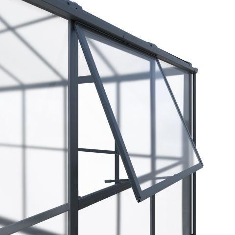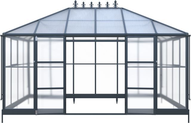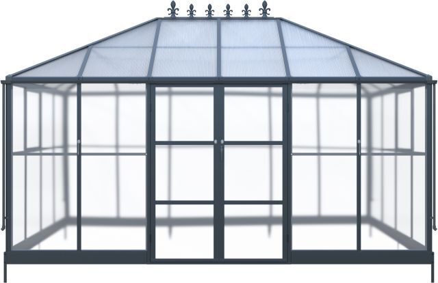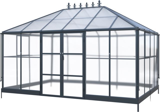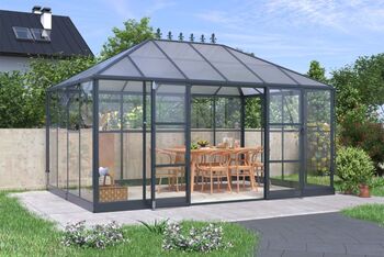 Pavillon / Gewächshaus Kromag KG-GWH12, 12 m2, ca. 284/421/262 cm, Wandhöhe: ca. 180 cm, Türmaße: ca. 141/176 cm, 1,2 mm starkes und pulverbeschichtetes Aluminiumgestell, 0,8 mm starker und verzinkter Stahlbodenrahmen mit Pulverbeschichtung, 4 mm Doppelstegplatten aus Polycarbonat für das Dach, 2 mm klare und massive Polycarbonatplatten für Wände/Türen/Fenster, Farbe: schwarz (RAL9005), originalverpackt (2 Kartons),