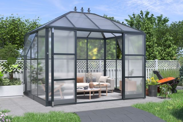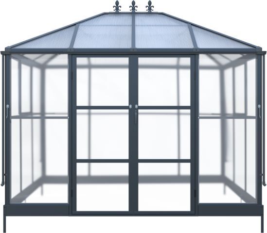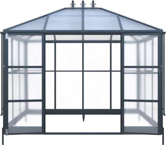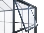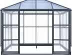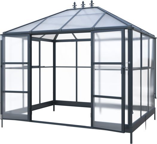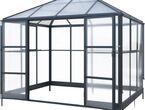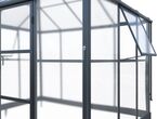 Pavillon / Gewächshaus Kromag KG-GWH6, 6 m2, ca. 215/284/243 cm, Wandhöhe: ca. 180 cm, Türmaße: ca. 135/176 cm, 1,2 mm starkes und pulverbeschichtetes Aluminiumgestell, 0,8 mm starker und verzinkter Stahlbodenrahmen mit Pulverbeschichtung, 4 mm Doppelstegplatten aus Polycarbonat für das Dach, 2 mm klare und massive Polycarbonatplatten für Wände/Türen/Fenster, Farbe: schwarz (RAL9005), originalverpackt (2 Kartons),