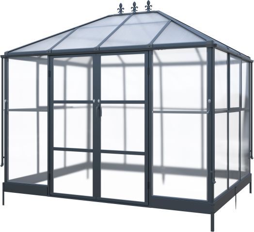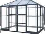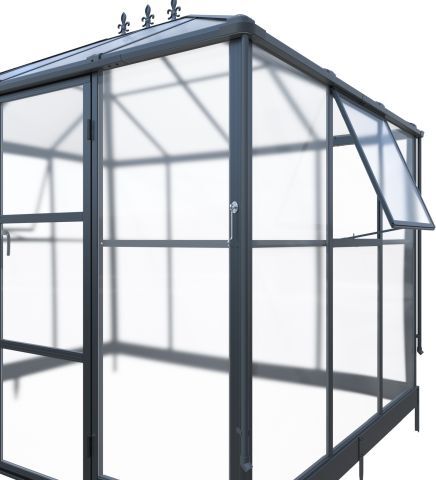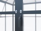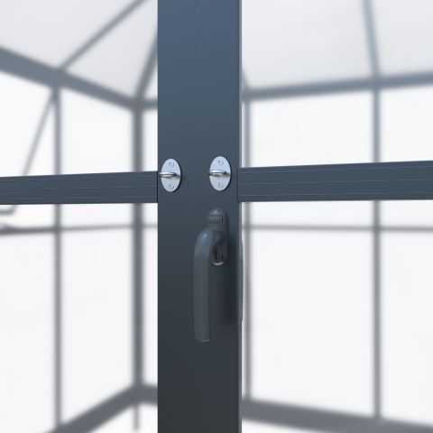 Pavillon / Gewächshaus Kromag KG-GWH6, 6 m2, ca. 215/284/243 cm, Wandhöhe: ca. 180 cm, Türmaße: ca. 135/176 cm, 1,2 mm starkes und pulverbeschichtetes Aluminiumgestell, 0,8 mm starker und verzinkter Stahlbodenrahmen mit Pulverbeschichtung, 4 mm Doppelstegplatten aus Polycarbonat für das Dach, 2 mm klare und massive Polycarbonatplatten für Wände/Türen/Fenster, Farbe: schwarz (RAL9005), originalverpackt (2 Kartons),