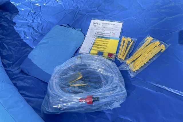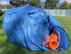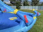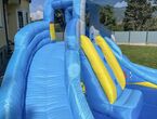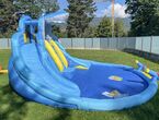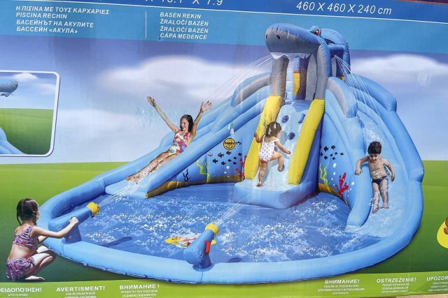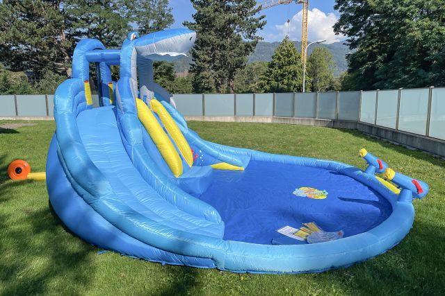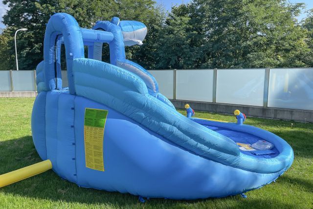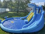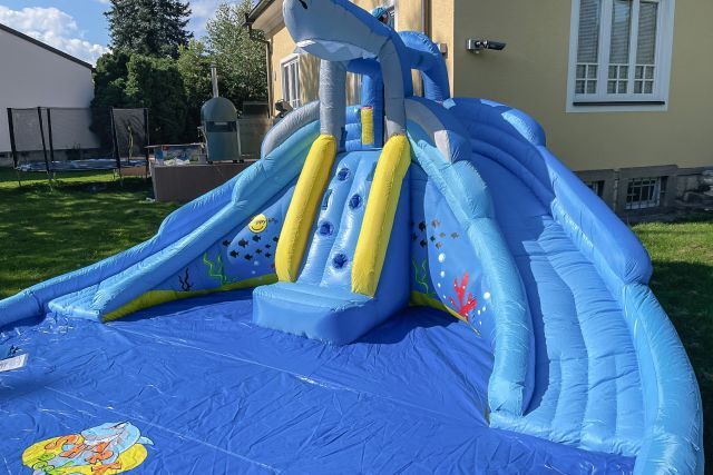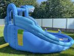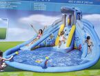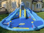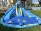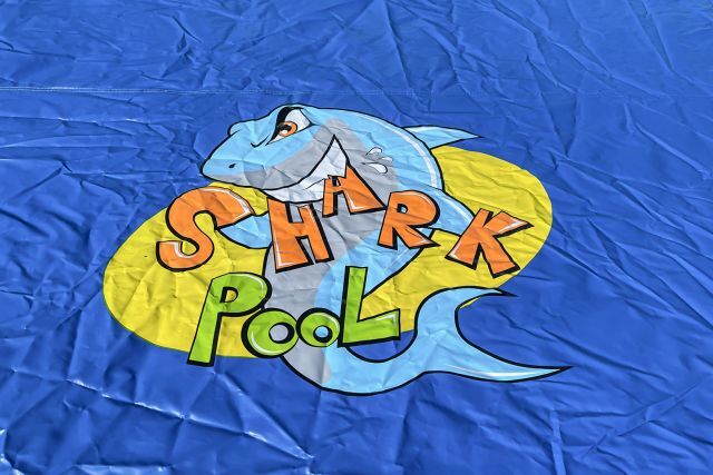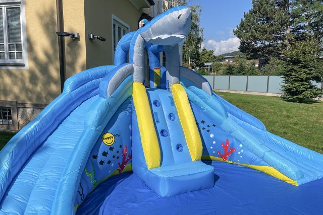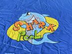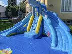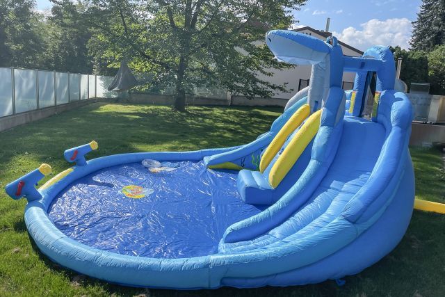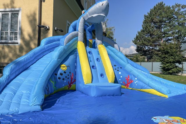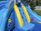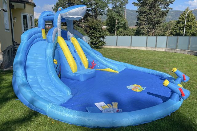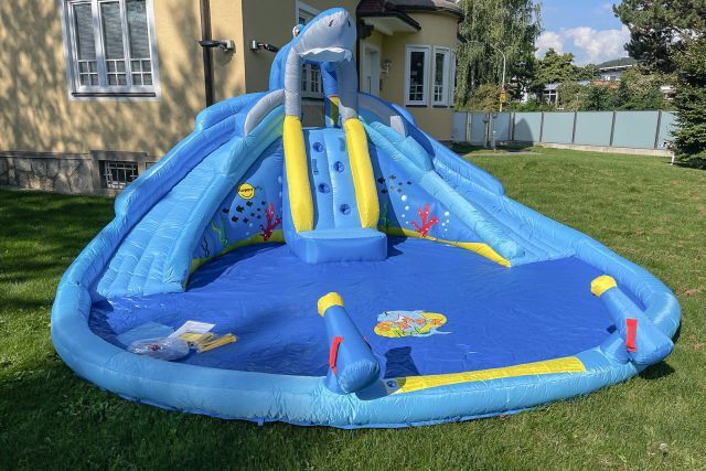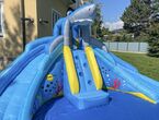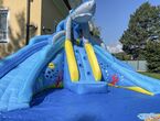Happy Hop The Shark Pool 9421, Rutschen nass und trocken verwendbar, für max. 4 Kinder, l/b/h 460/460/240 cm, inklusive Gebläse, Schlauchsystem für 2 Wasserrutschen und 2 Wasserkanonen, Bodenanker, Reparaturset und Tragetasche, originalverpackt, 31 kg, für Kinder ab 3 Jahren
