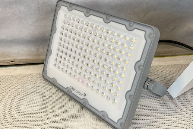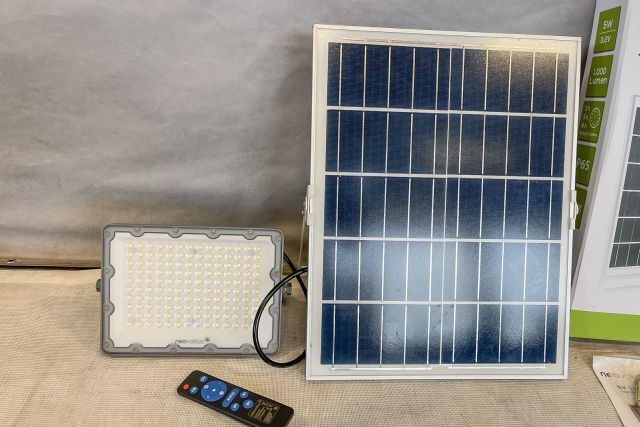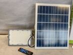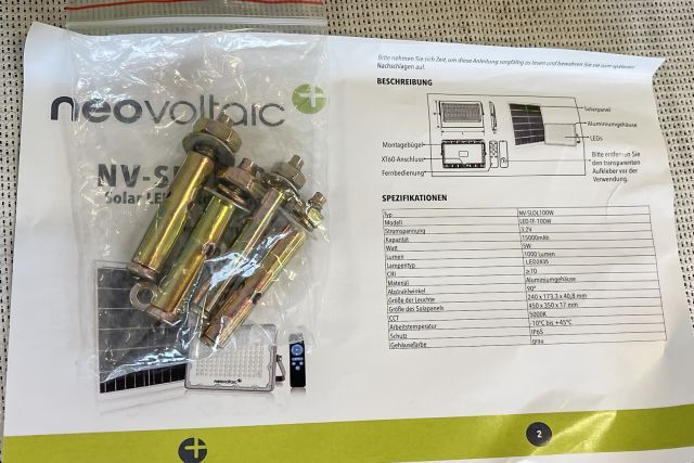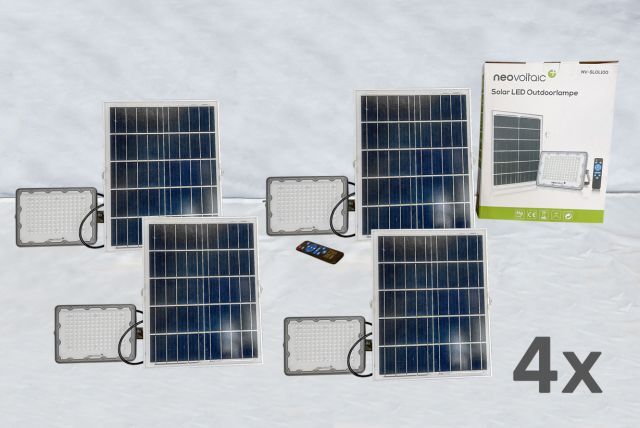 4 Stück Solar LED Outdoorlampe neovoltaic NV-SLOL100, 4 Stück, Akku LED Scheinwerfer 100W (240/173/41 mm), integrierter Akku 3,2 V, 15 Ah, mit PV Modul (350/450/17 mm) 5 V, 20 W, Lichtfarbe 5000K, Strahlwinkel 90°, Ladezeit 5 bis 6 Stunden, Alugehäuse, mit Fernbedienung