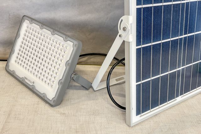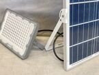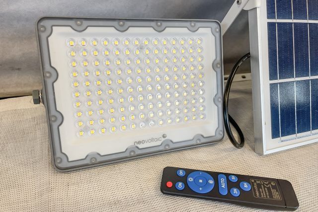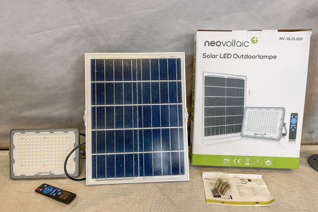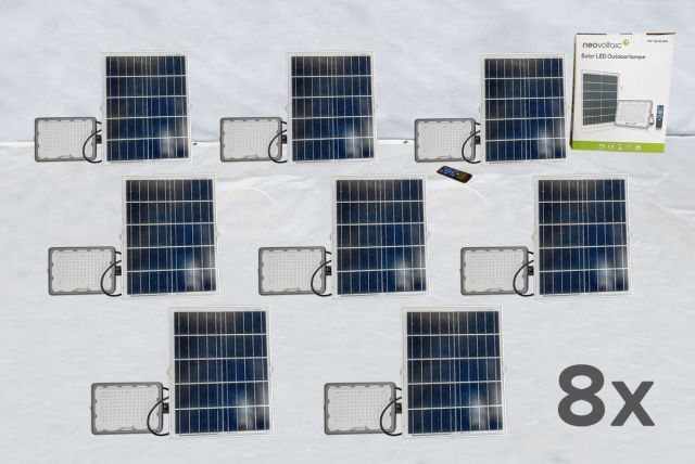 8 Stück Solar LED Outdoorlampe neovoltaic NV-SLOL100, 8 Stück, Akku LED Scheinwerfer 100W (240/173/41 mm), integrierter Akku 3,2 V, 15 Ah, mit PV Modul (350/450/17 mm) 5 V, 20 W, Lichtfarbe 5000K, Strahlwinkel 90°, Ladezeit 5 bis 6 Stunden, Alugehäuse, mit Fernbedienung