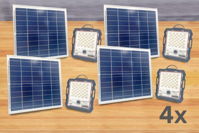 4 Stück Solar LED Outdoorlampe mit Kamera neovoltaic NV-SLOLK100, 4 Stück Akku LED Scheinwerfer 100 W mit Kamera (217/179/45 mm), 2 integrierte Akkus 3,2 V, 12 Ah, mit PV Modul (350/350/17 mm) 5 V, 20 W, Strahlwinkel 120°, APP gesteuert (tuya), dimmbar, Fotofunktion, Videofunktion, Bewegungserkennungsalarm, Zeitsteuerung, Leuchtzeit 10 bis 20 Stunden, Alugehäuse, mit Fernbedienung