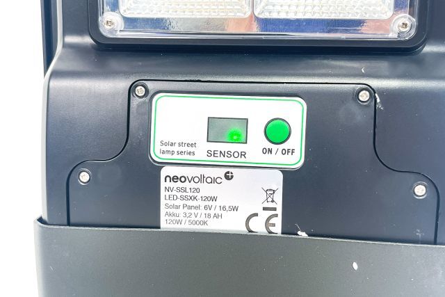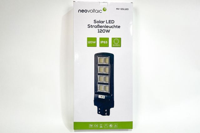 Solar LED Straßenleuchte neovoltaic NV-SSL120, Akku LED Straßenleuchte 120W (745/230/55 mm), wasserdicht, IP65, integrierter Akku 3,2 V, 18 Ah, mit integrierten PV Modul 6 V, 16,5 W, Lichtfarbe 5000K, Abstrahlwinkel 120 Grad, Ladezeit 3-4 Stunden, Leuchtzeit 11-13 Stunden, inkl. 4 Befestigungsschrauben und Installationsrohr, Einbaugröße: 48 mm, Rohrgröße: 48/48/500 mm, originalverpackt