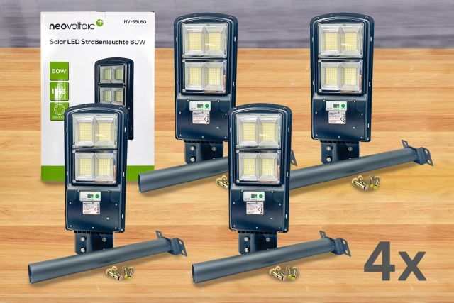 4 Stück Solar LED Straßenleuchte neovoltaic NV-SSL60, 4 Stück, Akku LED Straßenleuchte 60W (505/211/55 mm), wasserdicht, IP65, integrierter Akku 3,2 V, 10 Ah, mit integrierten PV Modul 6 V, 10,5 W, Lichtfarbe 5000K, Abstrahlwinkel 120 Grad, Ladezeit 3-4 Stunden, Leuchtzeit 11-13 Stunden, inkl. 4 Befestigungsschrauben und Installationsrohr, Einbaugröße: 48 mm, Rohrgröße: 48/48/500 mm, einzeln originalverpackt