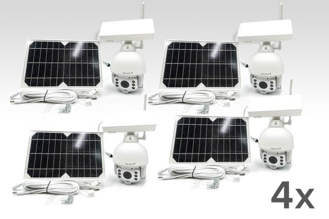 4 Stück Solar Sicherheitskamera mit LEDs neovoltaic NV-KSFL W, 4 Stück, Auflösung: 1920x1080, 1080 P, Energieversorgung: Solar & 6 integrierte Akkus (6x 2600 mAh=15600 mAh), Lokaler Speicher: MicroSD Karte max. 128 GB (nicht inkludiert), Cloud-Speicher (Alarmaufzeichnung), APP: TUYA , APP-Betriebssystem: Android, IOS, Beleuchtung: 6 Stück weiße LEDs mit 4 Stück Infrarot LEDs, Funktionen: Sirenen und Licht Alarmfunktion, unterstützt Cloud-Speicher & lokalen Speicher, Drei Nachtsicht-Modus: Beleuchtung 0.00001LUX volle Farbe Nachtsicht / Infrarot-Licht: Infrarot-LED-Abstand 30 m/ Weißes Licht: Weißes LED Abstand 30 m, Alarmmodus-Erkennung: PIR Personen Bewegungsmelder, Erkennungsabstand: 0~12 m, Erkennungswinkel: 120°, Alarm-Methode: Push-Alarm-Benachrichtigung auf das Mobiltelefon, Ton: 3 W Eingebauter Lautsprecher, Überwachungsbereich 20 m, Objektiv: 3.6mm Brennweite, 85° Winkel, Netzwerkfunktion: Bewegungserkennung (Video-Push, Alarm-Aufnahme, Bildaufnahme, E-Mail-Versand), Kunfiguration: SmartConfig, AP-Konfiguration, Manuell hinzufügen, Betriebsbedingungen:-30 ? ~ 60 ?, IP66