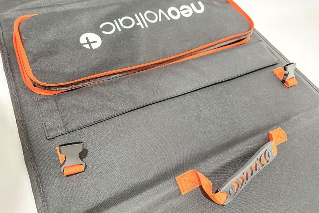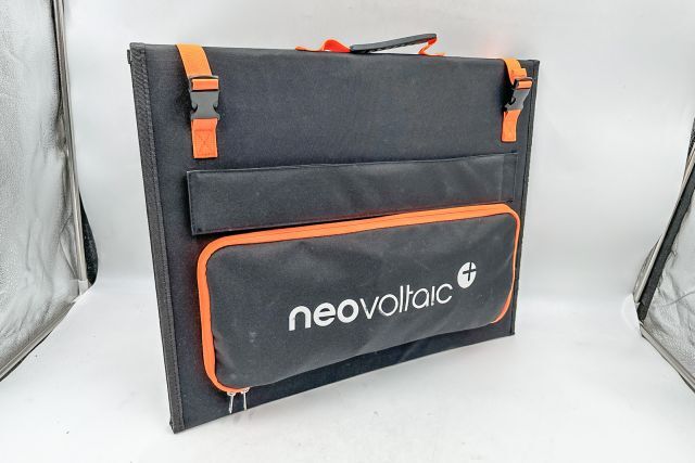 Faltbares Solarpanel neovoltaic FSP200W, 200W, 18,5V, max. Strom(Imp): 10,81 A, integriert in einer Tragetasche, Aufstellfüße für optimalen 45° Aufstellwinkel, Kabelsatz und Solarladeregler mit Ausgang 12V (Batterie, Kühlbox) und 5V (Handy, Laptop), Faltmaße: ca. 45/58 cm, Aufgeklappte Abmessung: ca. 178/58 cm, ca. 7 kg, originalverpackt (62/24/49 cm)