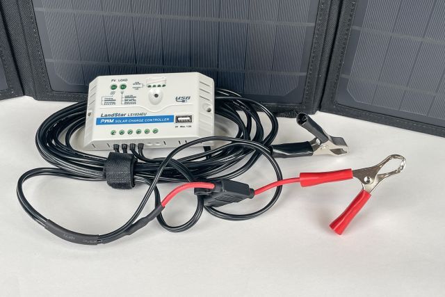 Faltbares Solarpanel neovoltaic, 50W, 50W, (4x 12,5W), 18V, integriert in einer Tragetasche, Kabelsatz und Solarladeregler mit Ausgang 12V (Batterie) und 5V (Handy, Laptop)
