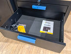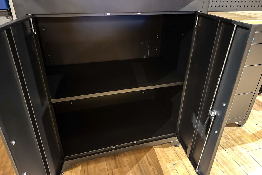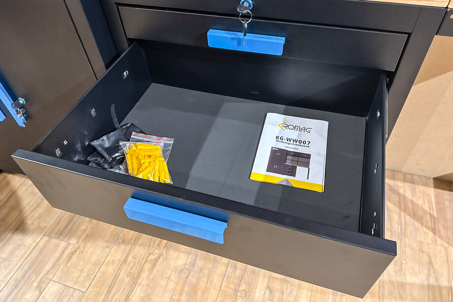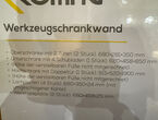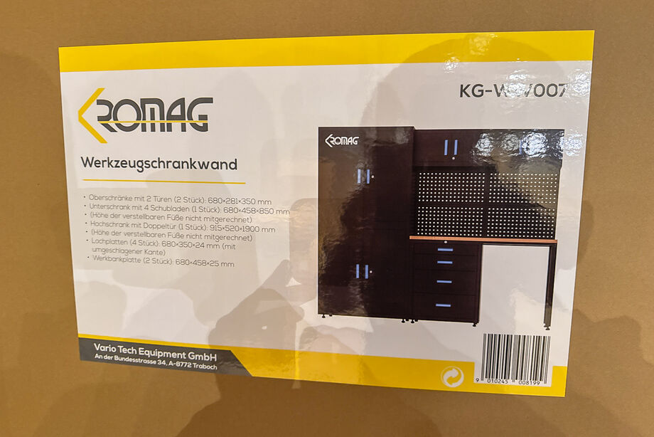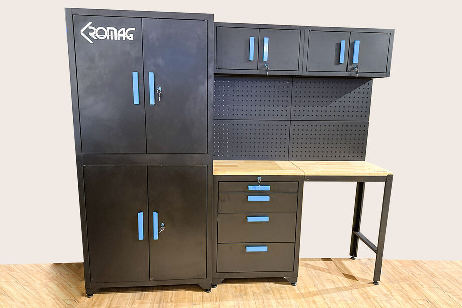 Werkstattschrankanlage Kromag KG-WW007, 2 Oberschränke mit 2 Türen: 680×281×350 mm, Unterschrank mit 4 Schubladen: 680×458×850 mm, (Höhe der verstellbaren Füße nicht mitgerechnet), Hochschrank mit Doppeltür: 915×520×1900 mm, (Höhe der verstellbaren Füße nicht mitgerechnet), Lochplatten (4 Stück): 680×350×24 mm (mit umgeschlagener Kante), 2 Werkbankplatten: 680×458×25 mm, originalverpackt