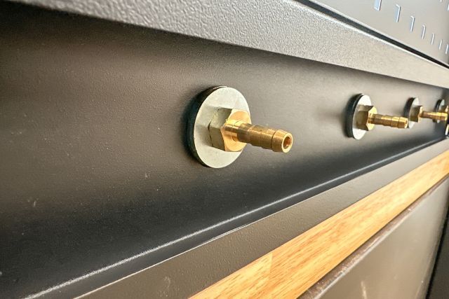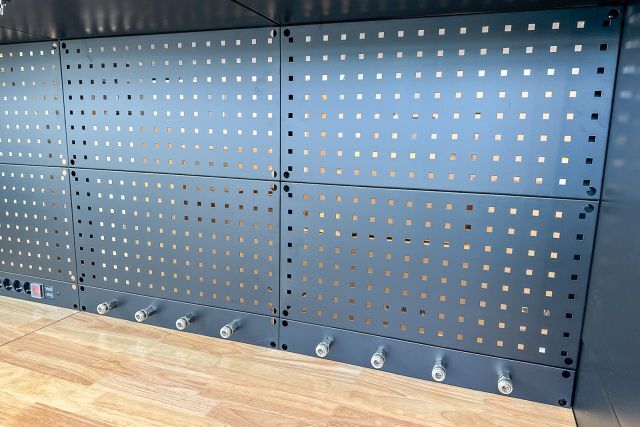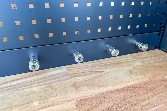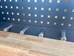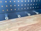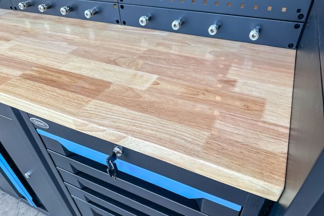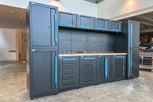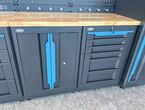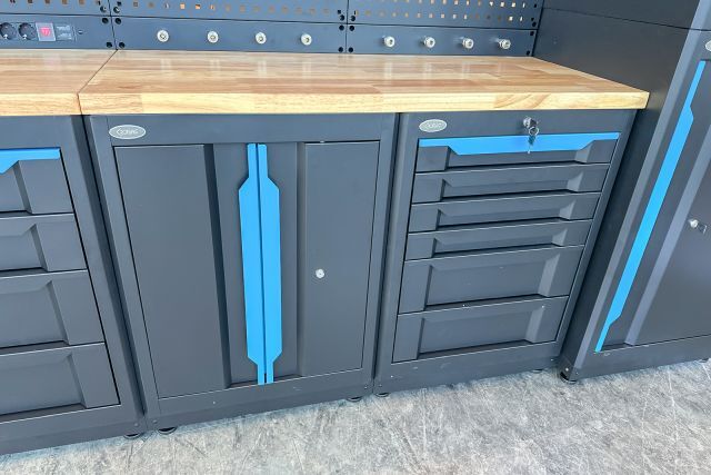 Werkstattschrankanlage Kromag KG-WW370, ca. 370/61/198 cm, 31-teilig, bestehend aus: 4 Metallschränken groß 1-türig (2x links öffnend, 2x rechts öffnend), Lochwand (8-teilig), 4 Oberschränke, Rubberwood Arbeitsplatte (zweiteilig), Ladenschrank 4-ladig, Ladenschrank 5-ladig, Ladenschrank 6-ladig, Unterschrank 2-türig, alle Schränke versperrbar, 12 Druckluftanschlüsse, 6-fach Steckdose, Diese Anlage ist freistehend und keine Komponente muss an einer Wand montiert werden (Rückwand und Oberschränke werden auf die mitgelieferten Träger montiert), originalverpackt in 22 Kartons