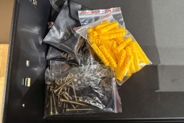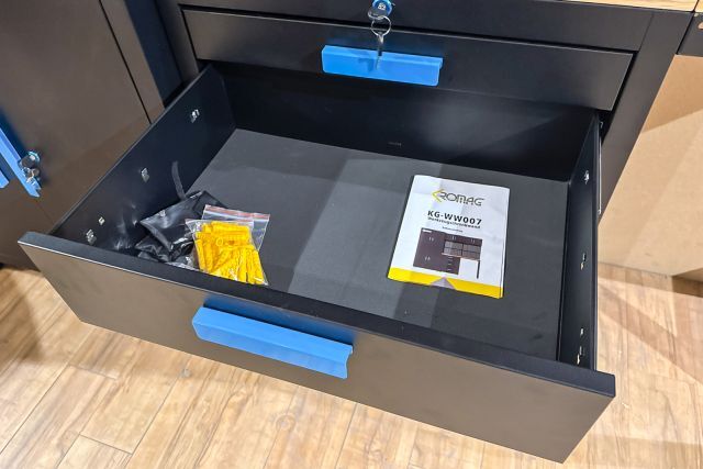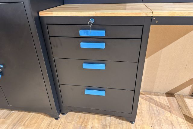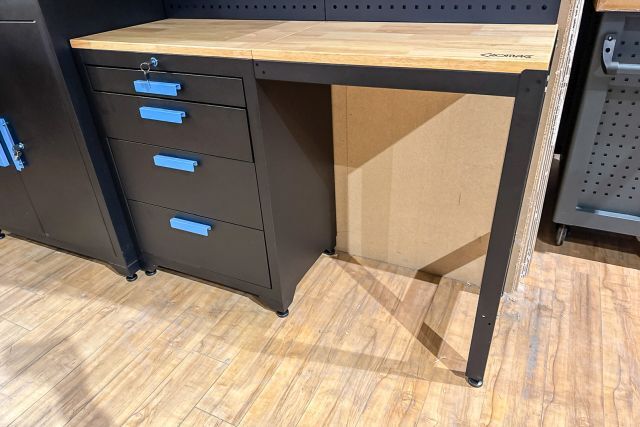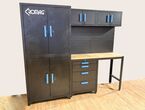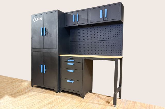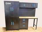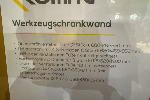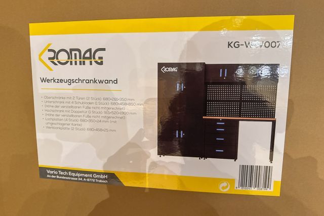 Werkstattschrankanlage Kromag KG-WW007, 2 Oberschränke mit 2 Türen: 680×281×350 mm, Unterschrank mit 4 Schubladen: 680×458×850 mm, (Höhe der verstellbaren Füße nicht mitgerechnet), 2 Werkbankplatten: 680×458×25 mm, originalverpackt