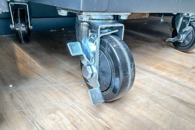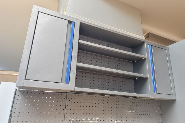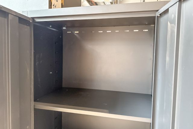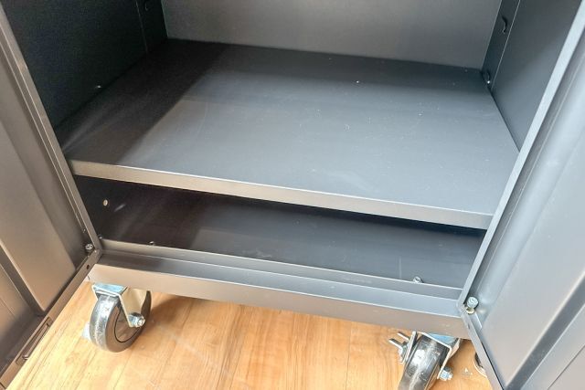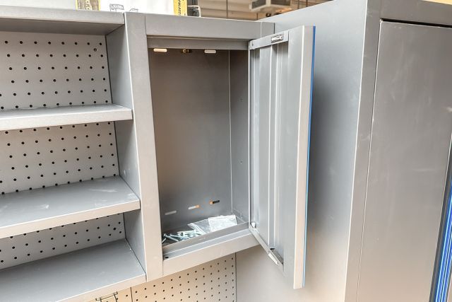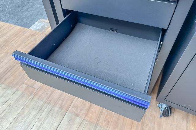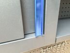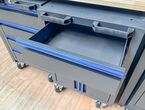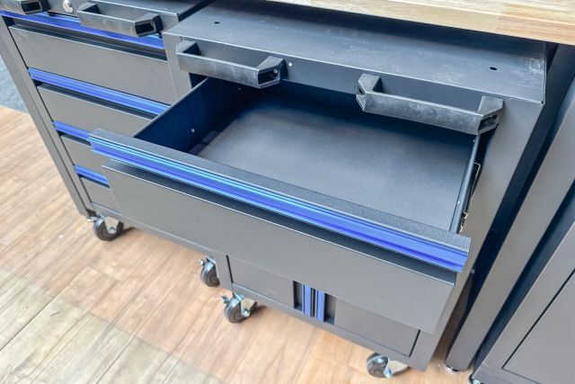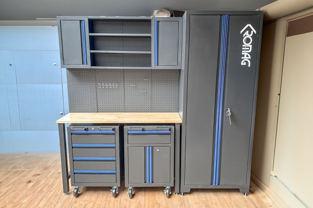 Werkstattschrankanlage Kromag KG-WW200, Gesamtaufstellfläche: ca. 270/47/195 cm, bestehend aus: Metallschrank (2-türig), Schubladenschrank (4-ladig), Schubladenschrank (2-türig/1-ladig), Arbeitstisch mit Arbeitsplatte, 2 Oberschränken, 4 Regalböden und 6 Lochplatten mit 32 Haken, kratz- und fleckenresistente Pulverbeschichtung, sanft schließende Kugelauszüge - belastbar bis 35 kg, verstellbare Nivellierfüße, Metallschrank Fachböden sind in 75-mm-Schritten verstellbar - Tragfähigkeit 65 kg, Schränke mit 4 Rollen ausgestattet - davon 2 schwenkbar mit Bremse (4"x1,25")