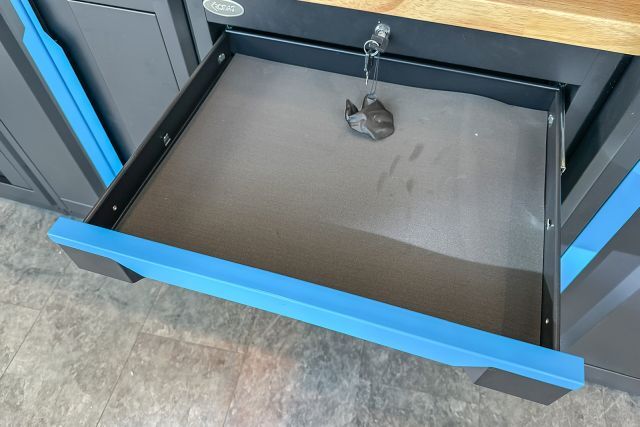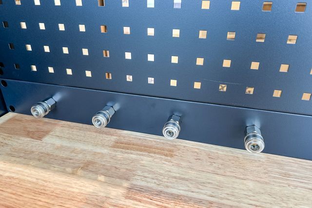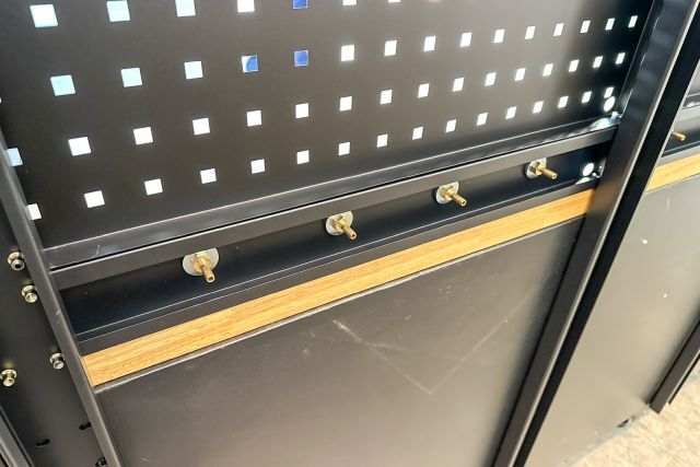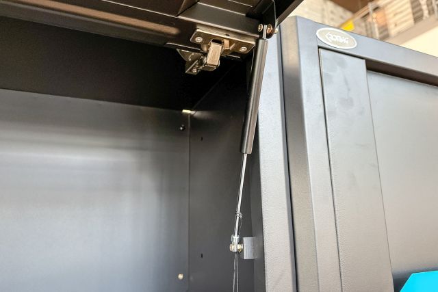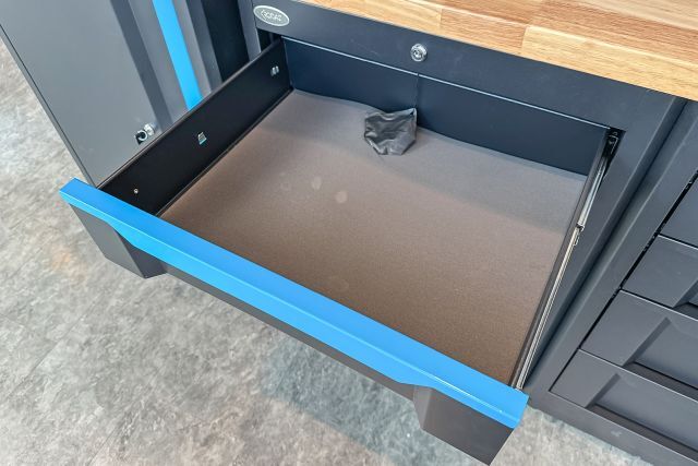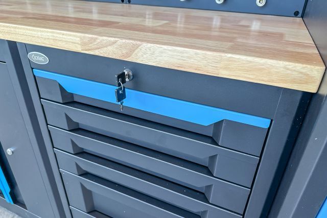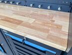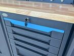 Werkstattschrankanlage Kromag KG-WW370, ca. 370/61/198 cm, 31-teilig, bestehend aus: 4 Metallschränken groß 1-türig (2x links öffnend, 2x rechts öffnend), Lochwand (8-teilig), 4 Oberschränke, Rubberwood Arbeitsplatte (zweiteilig), Ladenschrank 4-ladig, Ladenschrank 5-ladig, Ladenschrank 6-ladig, Unterschrank 2-türig, alle Schränke versperrbar, 12 Druckluftanschlüsse, 6-fach Steckdose, Diese Anlage ist freistehend und keine Komponente muss an einer Wand montiert werden (Rückwand und Oberschränke werden auf die mitgelieferten Träger montiert), originalverpackt in 11 Kartons