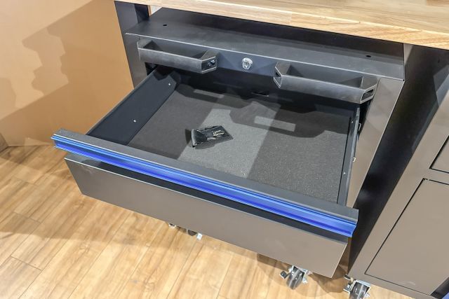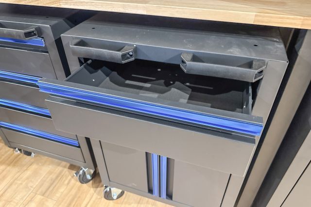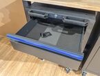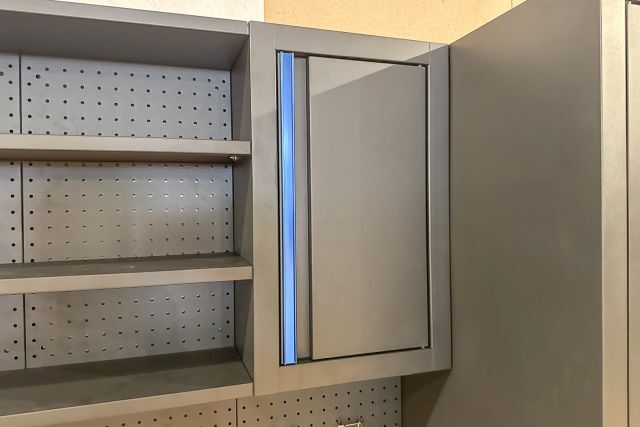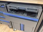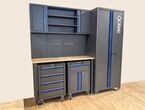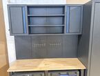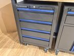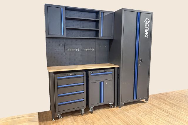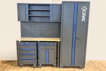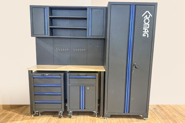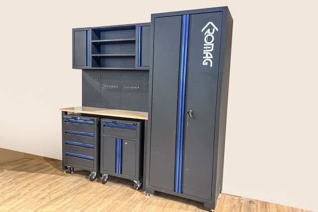 Werkstattschrankanlage Kromag KG-WW200, Gesamtaufstellfläche: ca. 270/47/195 cm, bestehend aus: Metallschrank (2-türig), Schubladenschrank (4-ladig), Schubladenschrank (2-türig/1-ladig), Arbeitstisch mit Arbeitsplatte, 2 Oberschränken, 4 Regalböden und 6 Lochplatten mit 32 Haken, kratz- und fleckenresistente Pulverbeschichtung, sanft schließende Kugelauszüge - belastbar bis 35 kg, verstellbare Nivellierfüße, Metallschrank Fachböden sind in 75-mm-Schritten verstellbar - Tragfähigkeit 65 kg, Schränke mit 4 Rollen ausgestattet - davon 2 schwenkbar mit Bremse (4"x1,25"),