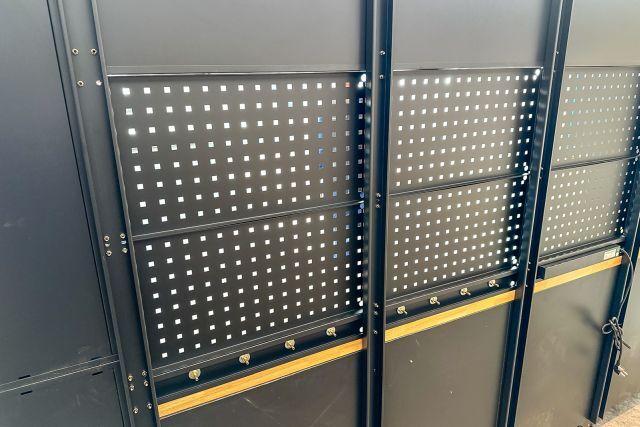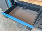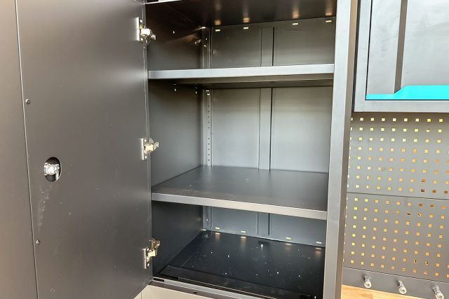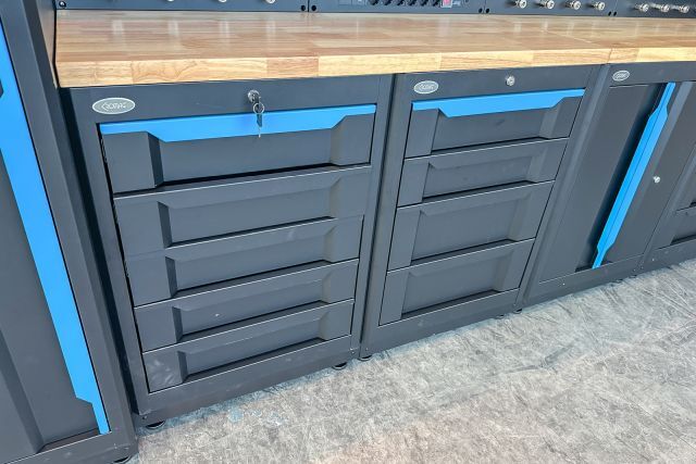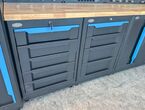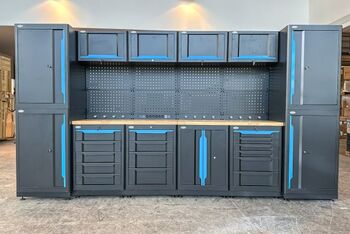 Werkstattschrankanlage Kromag KG-WW370, ca. 370/61/198 cm, 31-teilig, bestehend aus: 4 Metallschränken groß 1-türig (2x links öffnend, 2x rechts öffnend), Lochwand (8-teilig), 4 Oberschränke, Rubberwood Arbeitsplatte (zweiteilig), Ladenschrank 4-ladig, Ladenschrank 5-ladig, Ladenschrank 6-ladig, Unterschrank 2-türig, alle Schränke versperrbar, 12 Druckluftanschlüsse, 6-fach Steckdose, Diese Anlage ist freistehend und keine Komponente muss an einer Wand montiert werden (Rückwand und Oberschränke werden auf die mitgelieferten Träger montiert), originalverpackt in 11 Kartons,