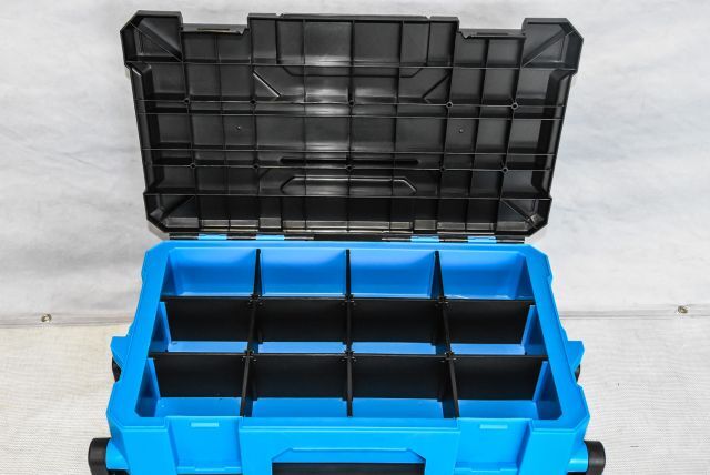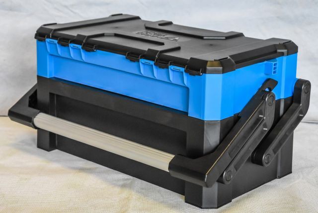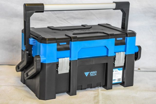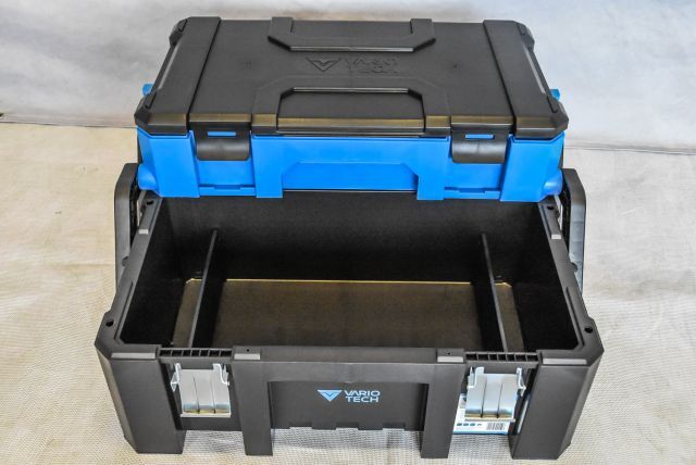 2 Werkzeugboxen Vario Tech VT-WB58, je 58/35,4/28,6 cm, mit Klappfunktion für vollen Zugang zur unteren Box, Aluminiumgriff, herausnehmbare Fächer