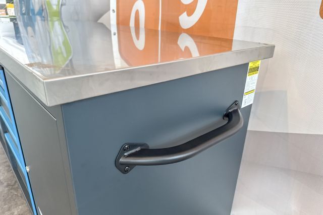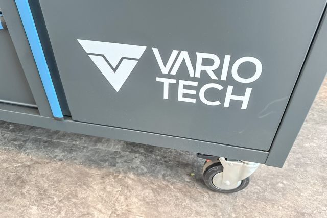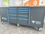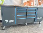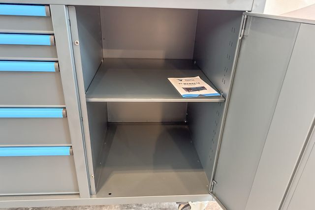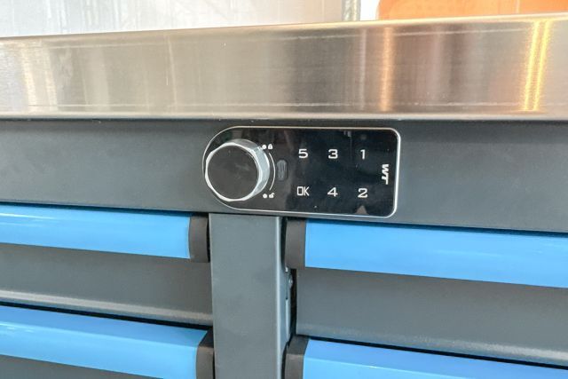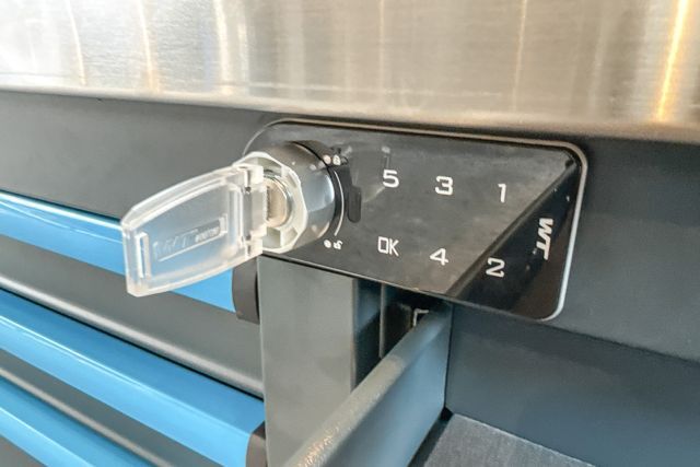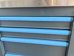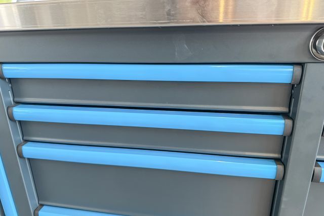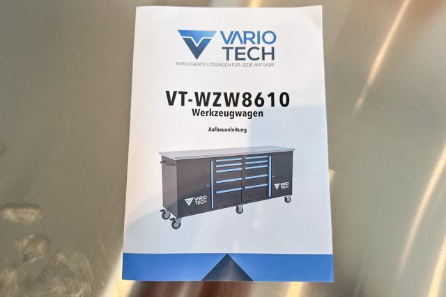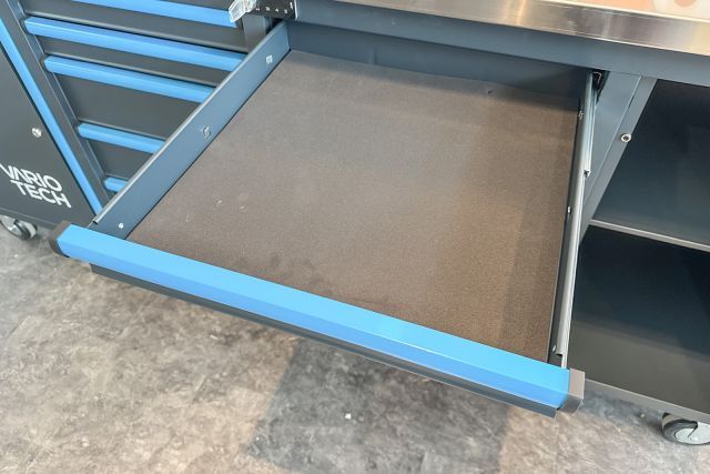 Werkzeugwagen Vario Tech VT-WZW8610, ca. 218/60/80,6 cm, Farben: anthrazit (RAL7016) und blau (RAL7460C), 10-ladig und 2-türig, digitales Schloss, 2,5 mm dicke EVA-Einlagen in den Schubladen, je Schublade 40 kg Traglast, Gesamttraglast: 550 kg, Türen mit Standard-Zylinderschloss, Arbeitsplatte: ca. 223/65/3,8 cm (36 mm Sperrholzplatte, beschichtet mit 1,2 mm Edelstahl), 6 TPR-Rollen - 5"x2" - davon 2 feststehend und 4 lenkbar mit Vollbremsen, 2 Schwerlast-Seitengriffe aus Stahl, Schubladen aus Sicherheitsgründen nur einzeln öffnungsbar