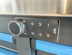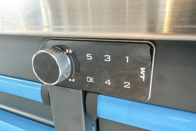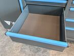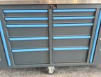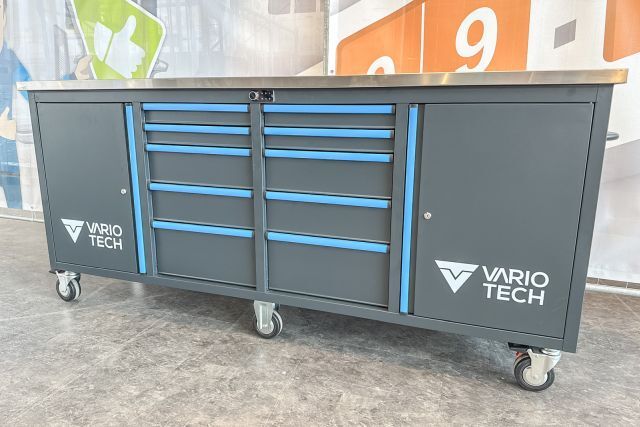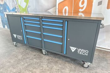 Werkzeugwagen Vario Tech VT-WZW8610, ca. 218/60/80,6 cm, Farben: anthrazit (RAL7016) und blau (RAL7460C), 10-ladig und 2-türig, digitales Schloss, 2,5 mm dicke EVA-Einlagen in den Schubladen, je Schublade 40 kg Traglast, Gesamttraglast: 550 kg, Türen mit Standard-Zylinderschloss, Arbeitsplatte: ca. 223/65/3,8 cm (36 mm Sperrholzplatte, beschichtet mit 1,2 mm Edelstahl), 6 TPR-Rollen - 5"x2" - davon 2 feststehend und 4 lenkbar mit Vollbremsen, 2 Schwerlast-Seitengriffe aus Stahl, Schubladen aus Sicherheitsgründen nur einzeln öffnungsbar,