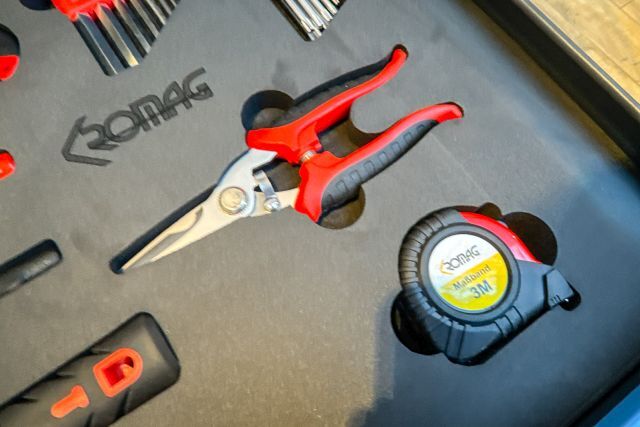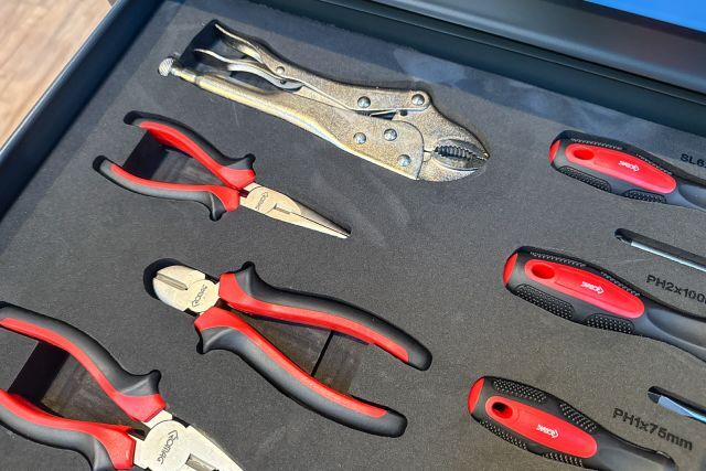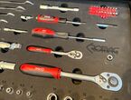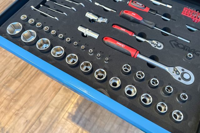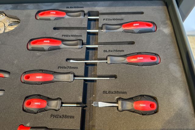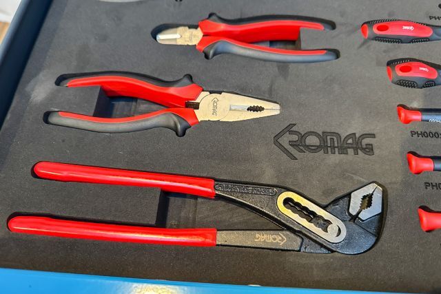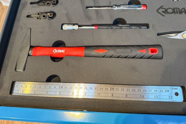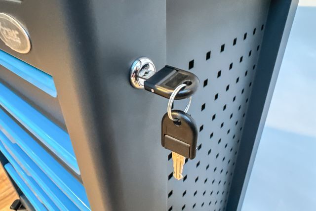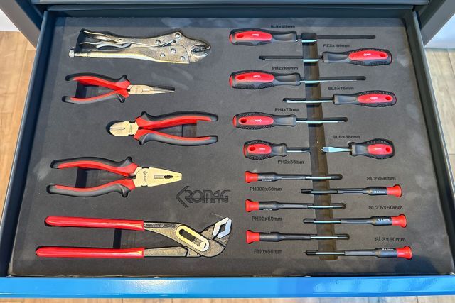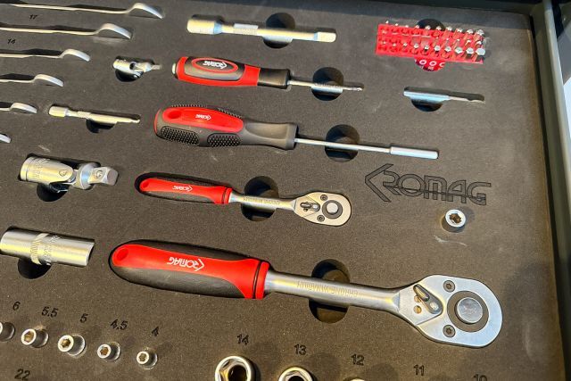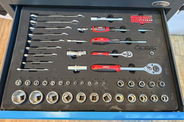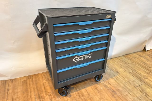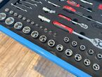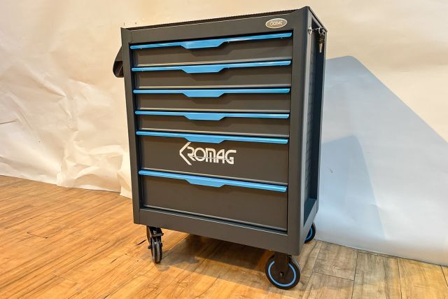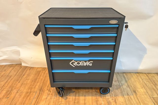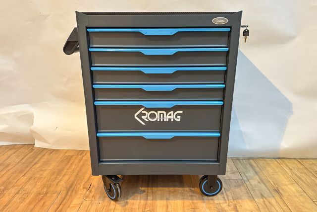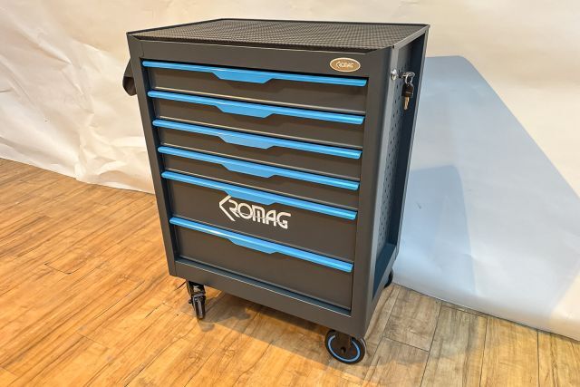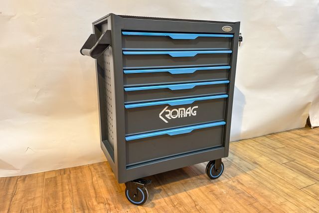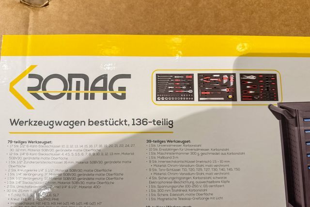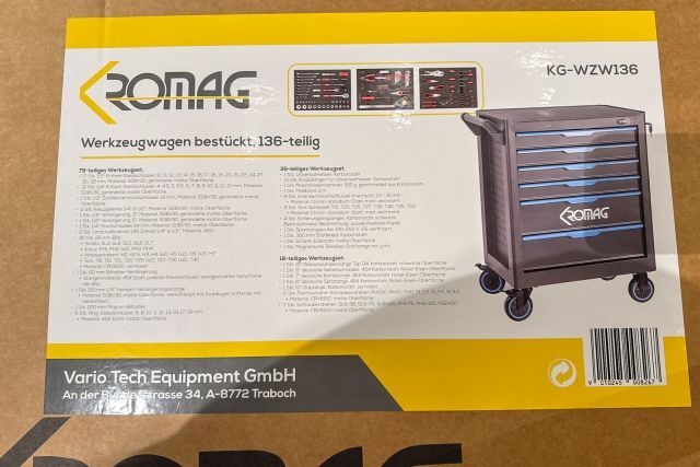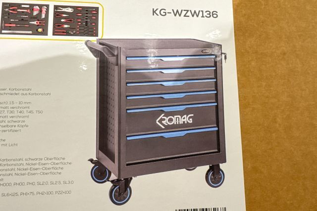 Werkzeugwagen Kromag KG-WZW136, befüllt, inklusive Werkzeug (136 Teile), 78/46/92 cm, 6 Schubladen, 46 kg, seitliche Lochwand, versperrbar, 4 Schwerlastrollen - 2 Rollen mit Sperrfunktion, originalverpackt,
